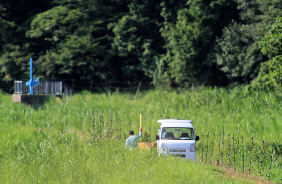 女布に親子のこうのとりがいる報告を受け、8時5分に堤防近くでくうちゃん開放です。