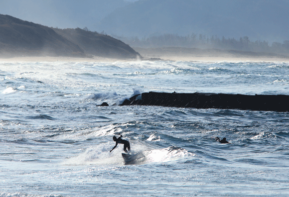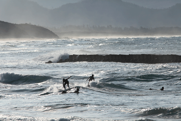 >防波堤の合間から波を待つサーファー達
