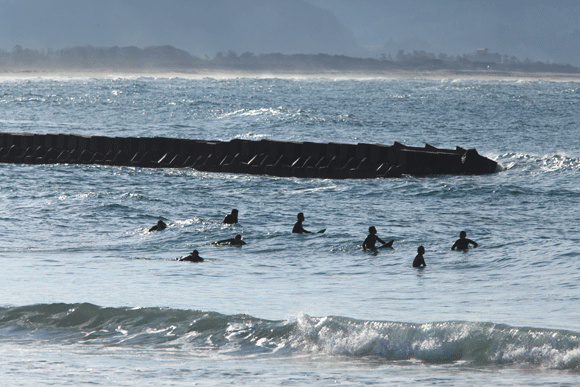 防波堤の合間から波を待つサーファー達